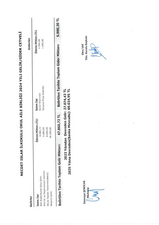 2024 YILI OKUL AİLE BİRLİĞİ GELİR GİDER CETVELİ
